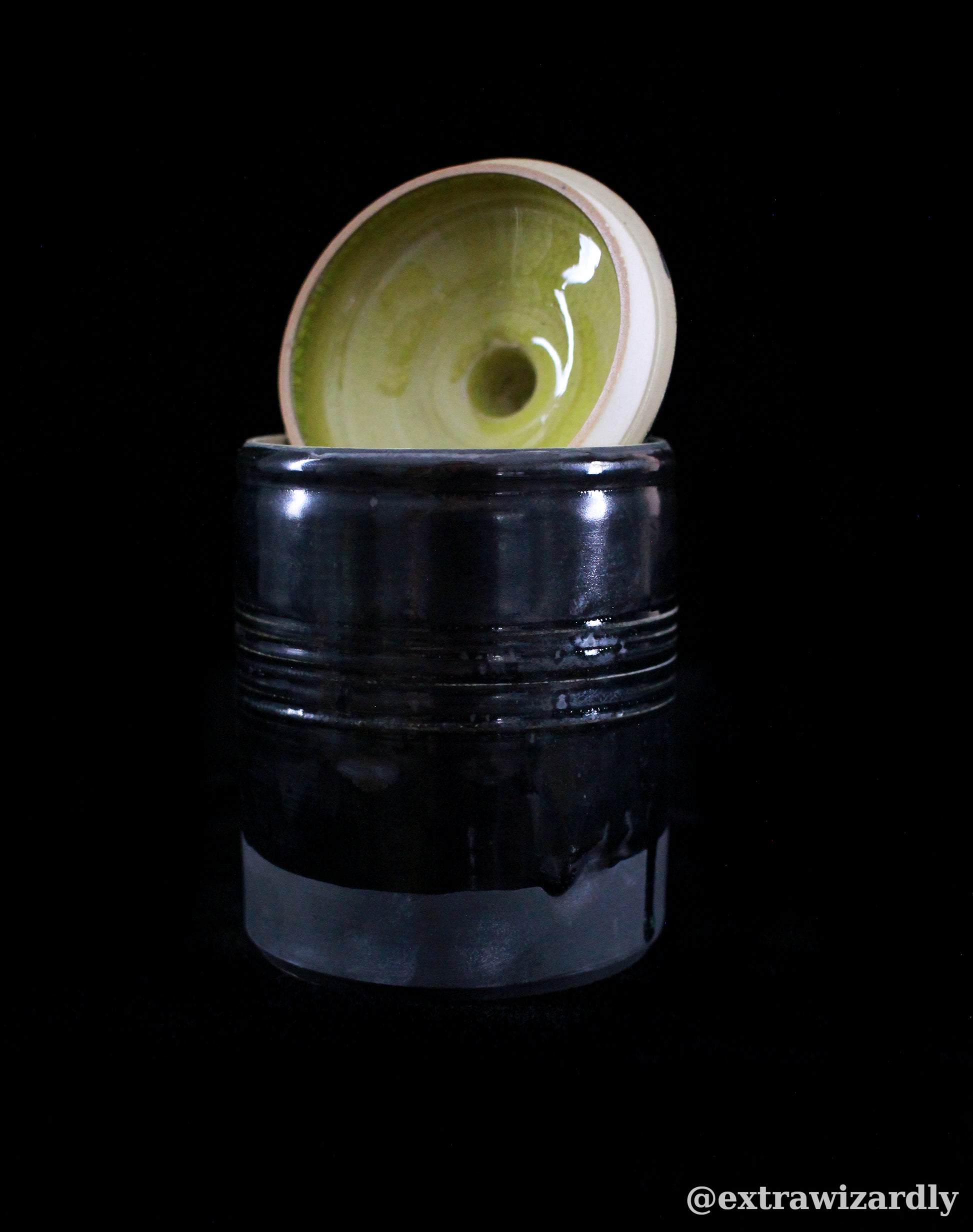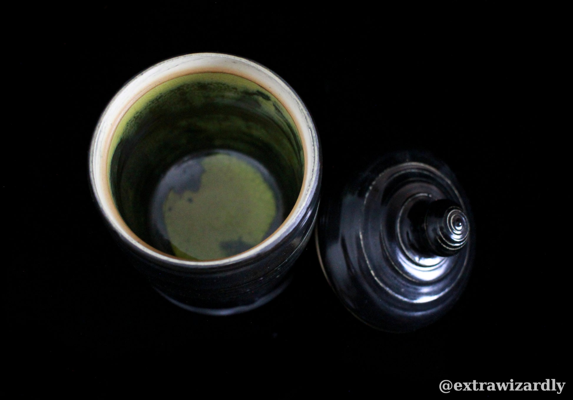 Outwardly, it is a vessel of perfect restraint—sleek, obsidian-black, its surface swallowing the light with the solemnity of a closed grimoire. But lift the lid… ah. The interior screams in neon green, a shock of venomous brilliance, like the last gasp of a dying star or the glow of a witch’s private laughter.
