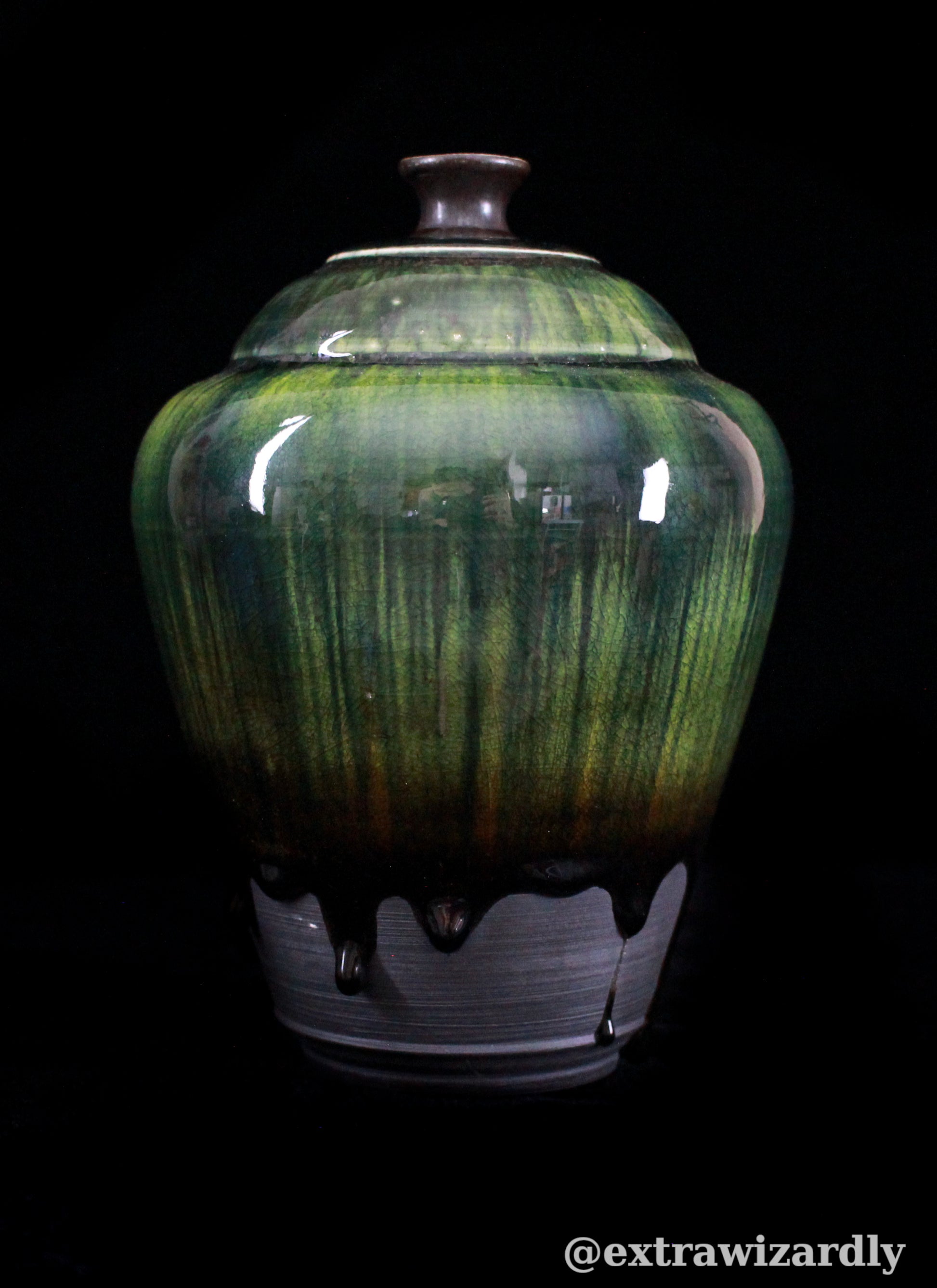 Behold—a vessel that hoards more than water. Its form, broad-shouldered and solemn, tapers to a throat as narrow as a spell’s final syllable. But the true sorcery lies in the glaze: a necromantic green that glows like swamp-light, deepening to black at rim and base—as if the bottle is slowly sinking into its own shadow. And the skirt of glaze-droplets? Perfect as poisoned dew. A phylactery, by definition, is meant to preserve something precious. Plant hemlock here. Plant lilies. Either way, it will keep your secrets.