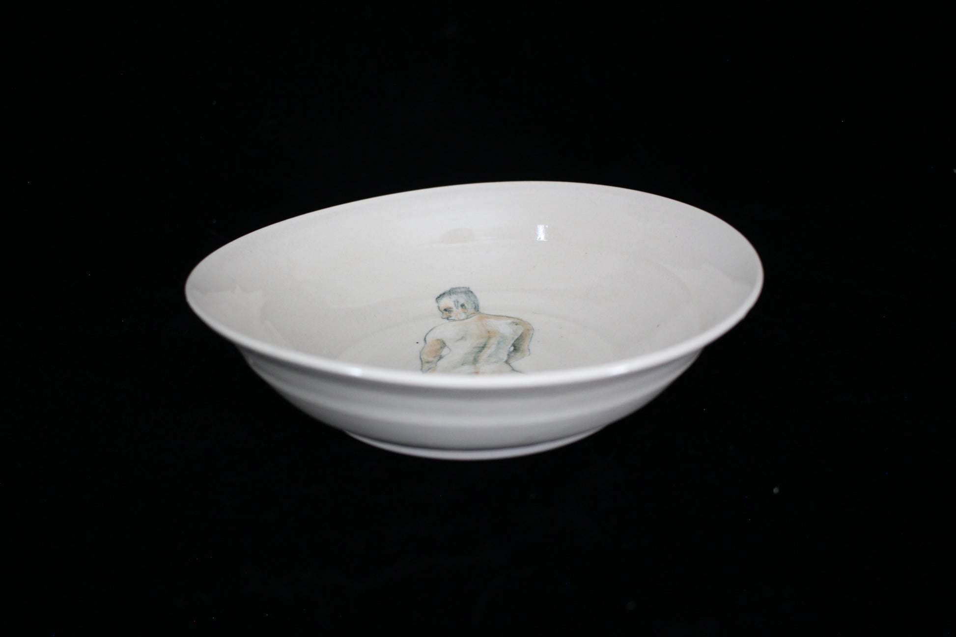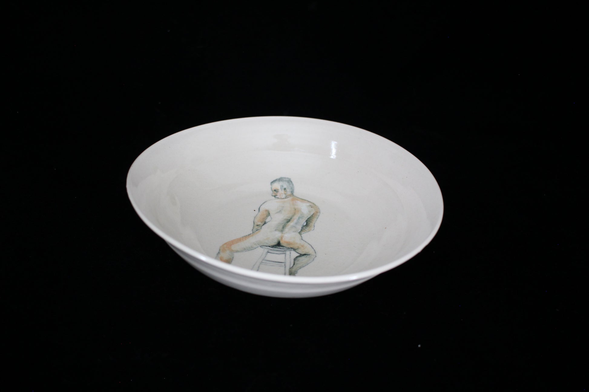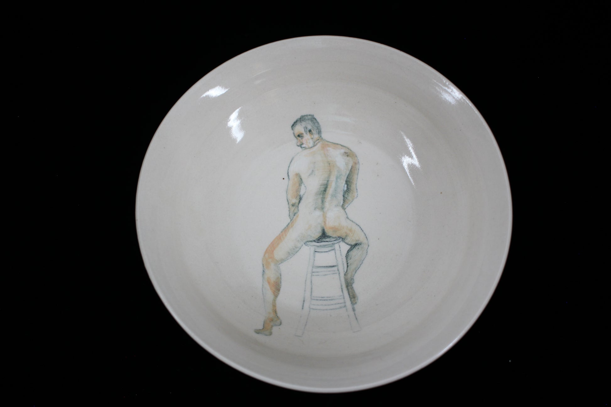 This cream colored stoneware bowl, features a hand drawn figure study.