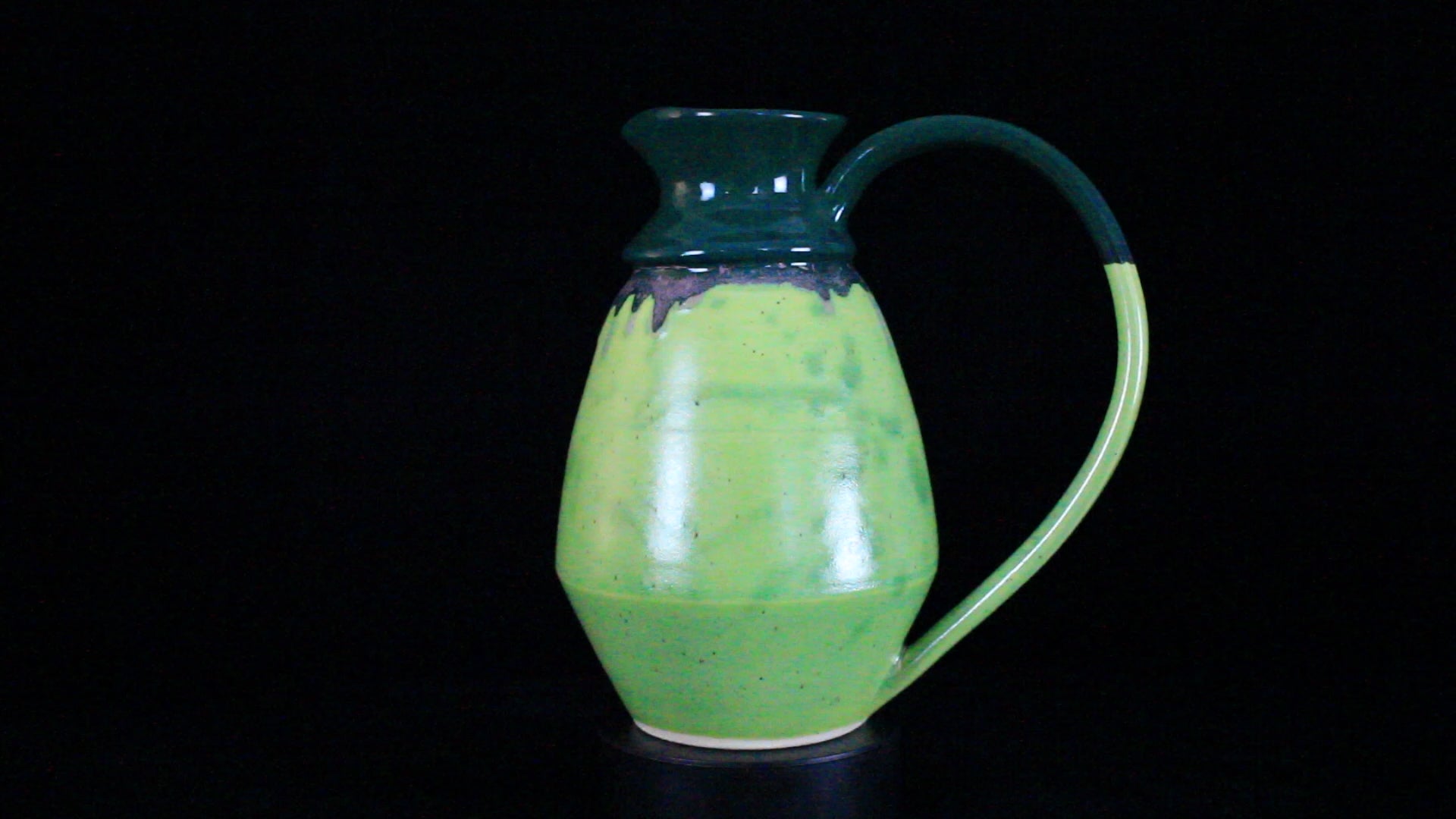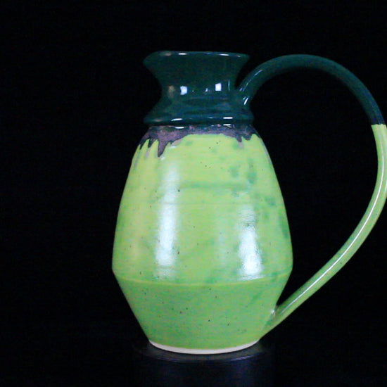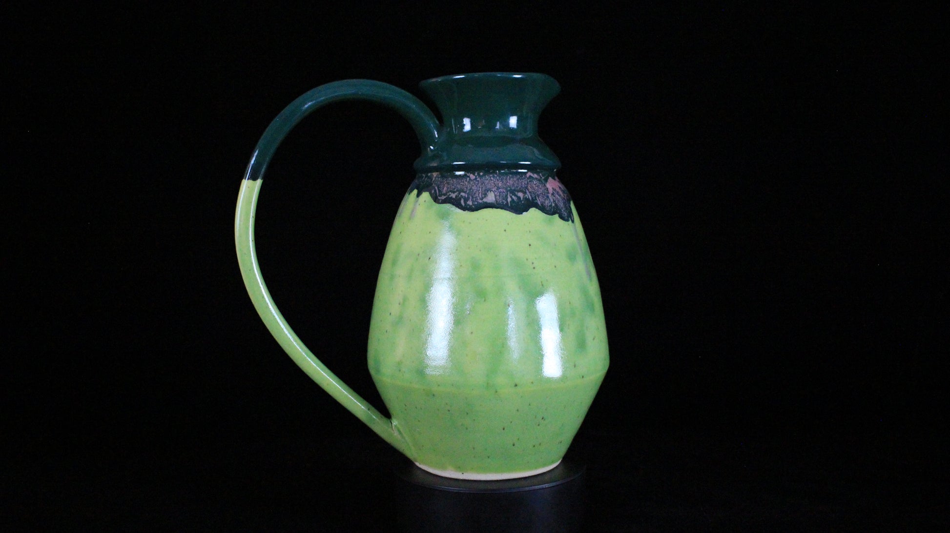 This one of a kind, large stoneware pitcher features a dual toned, green glaze with pink flecks.