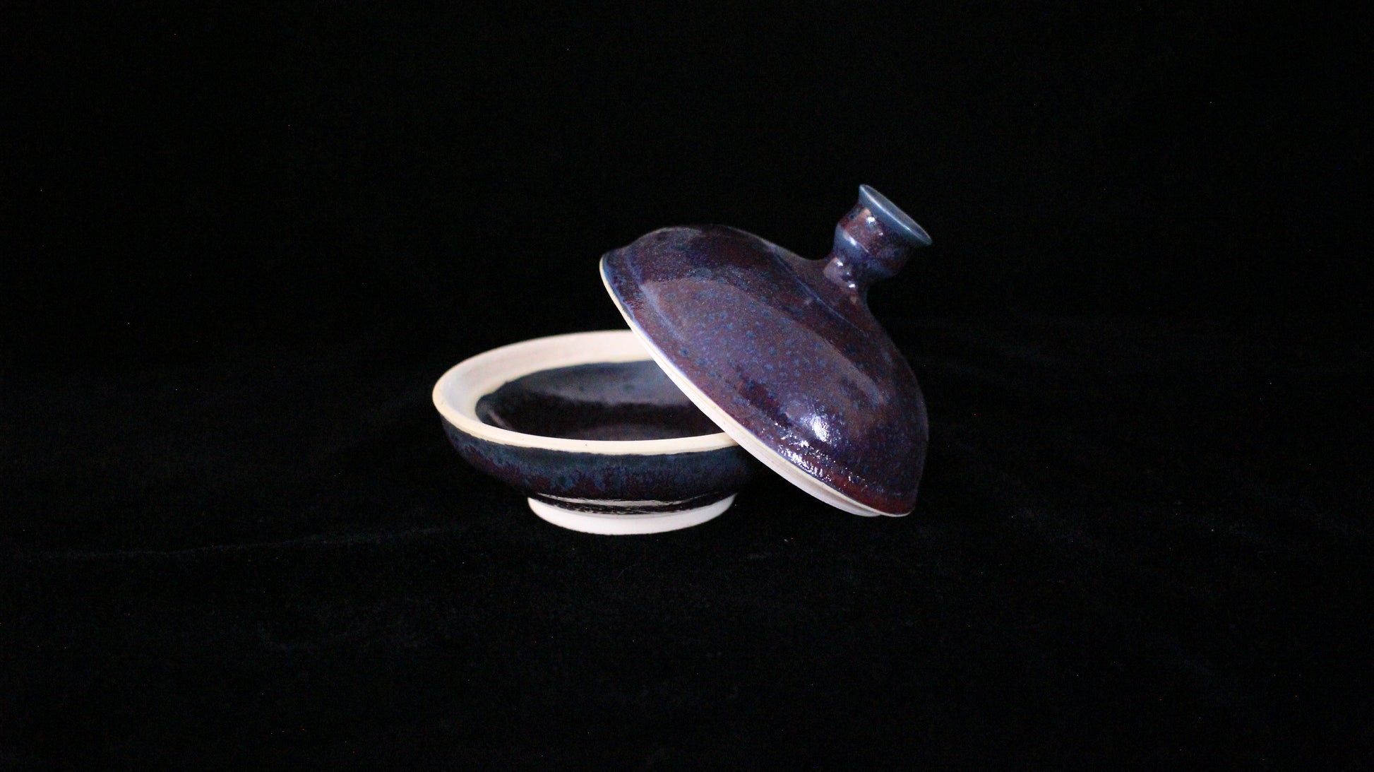 This small dome-lidded jar, features a dark violet textured glaze. it would be a perfect jewelry dish, or jar for some small precious item kept on a vanity. The knob of the lid could also be used to hold a small chime candle, making it perfect for spellwork.