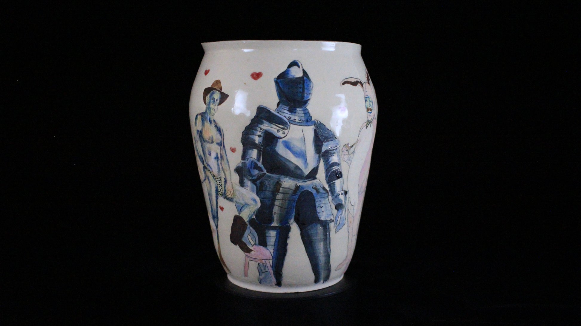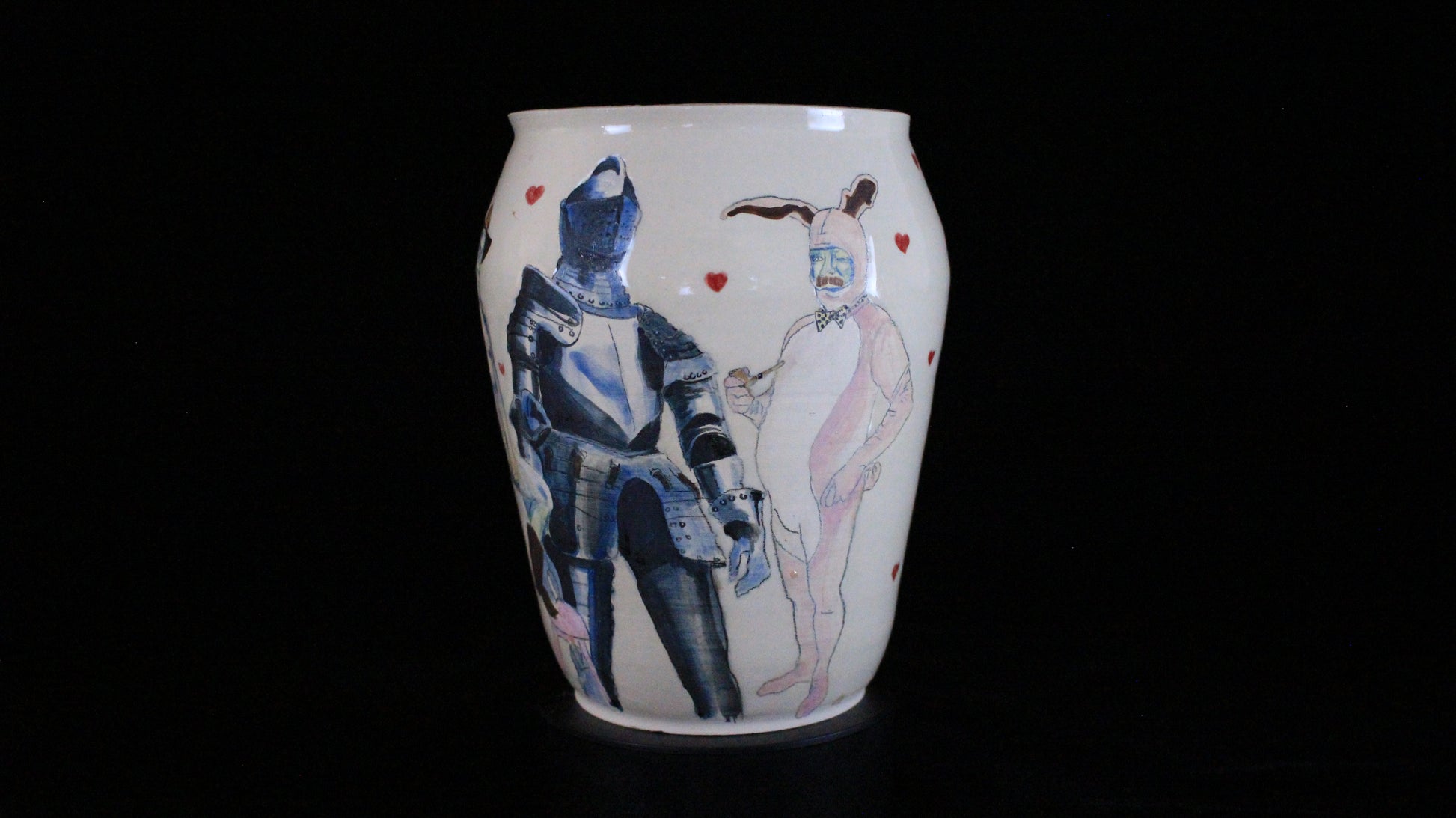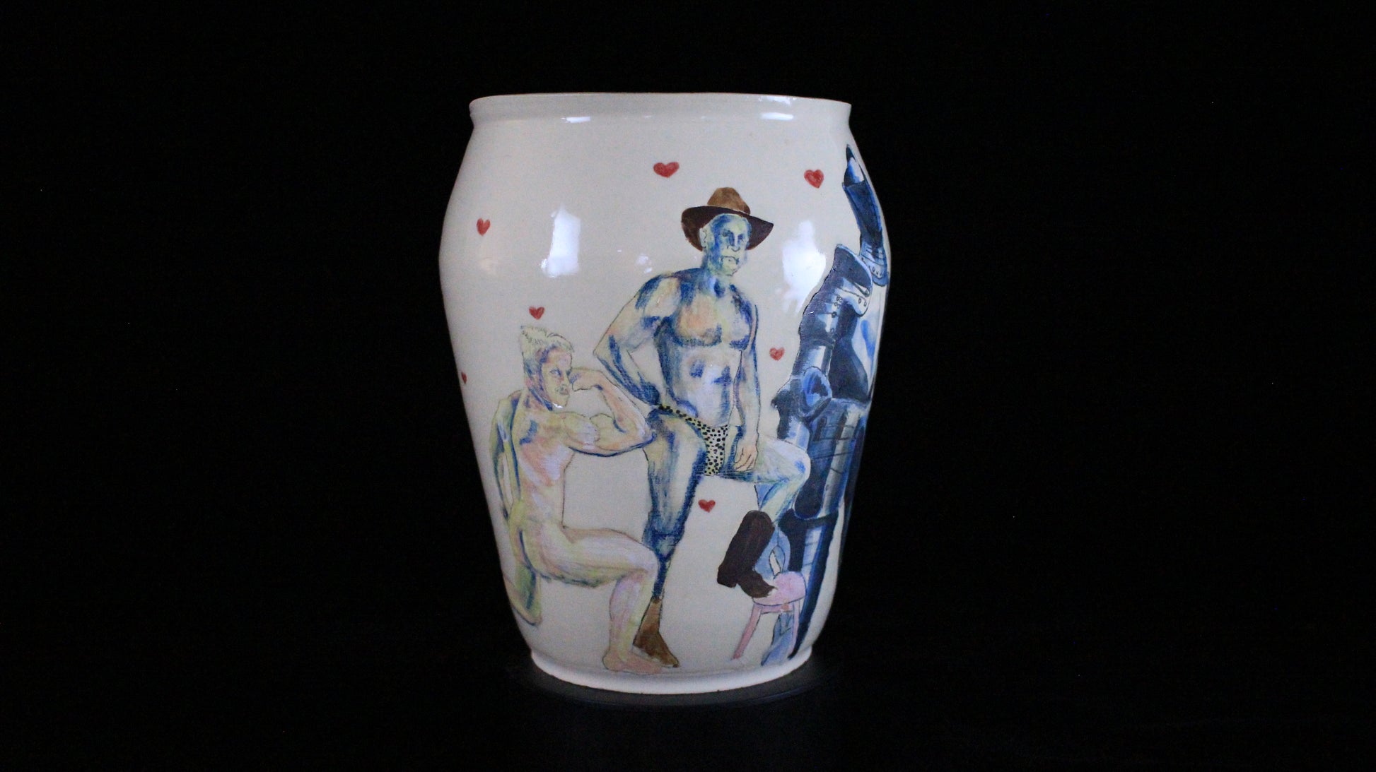 This Glazed Stoneware Vase, a unique piece standing at features a hand-painted composition depicting erotically posed male bodybuilders, a suit of armor, and a man in a bunny suit. Put some flowers in it or something, pansy!