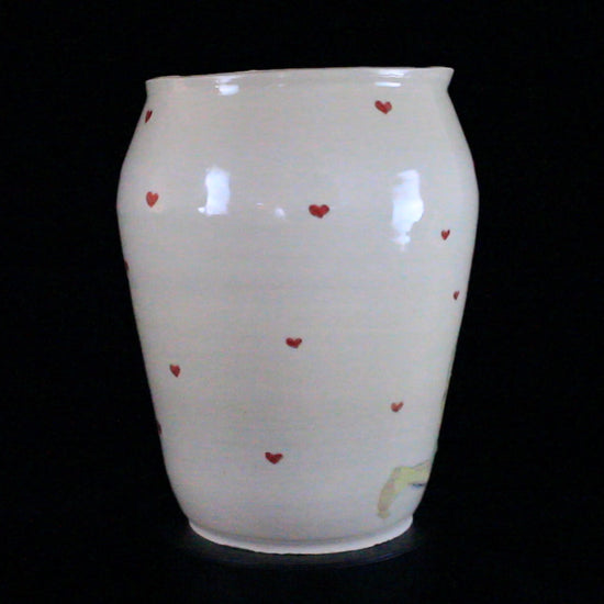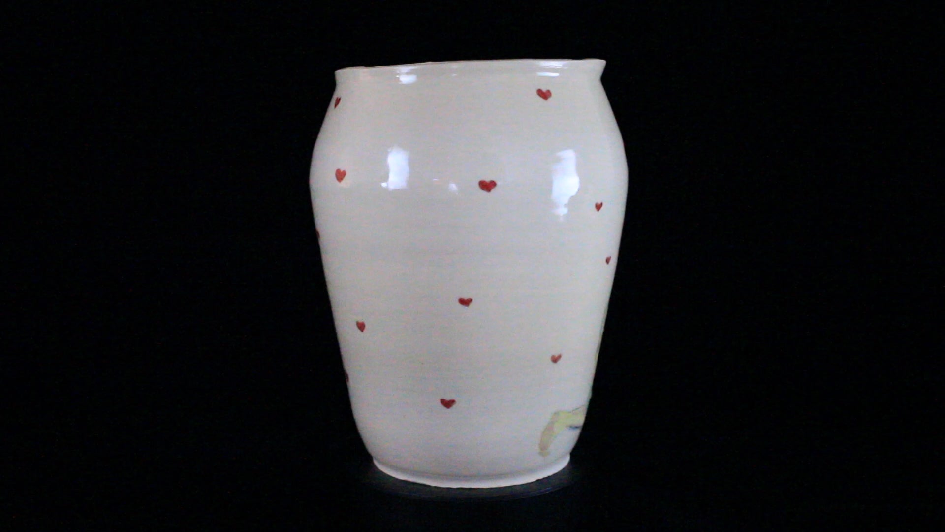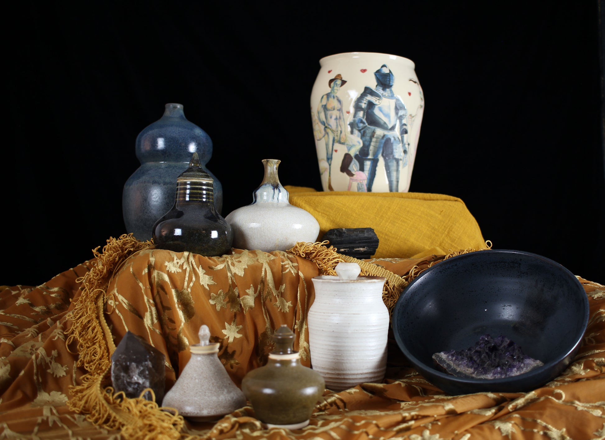 This Glazed Stoneware Vase, a unique piece standing at features a hand-painted composition depicting erotically posed male bodybuilders, a suit of armor, and a man in a bunny suit. Put some flowers in it or something, pansy!