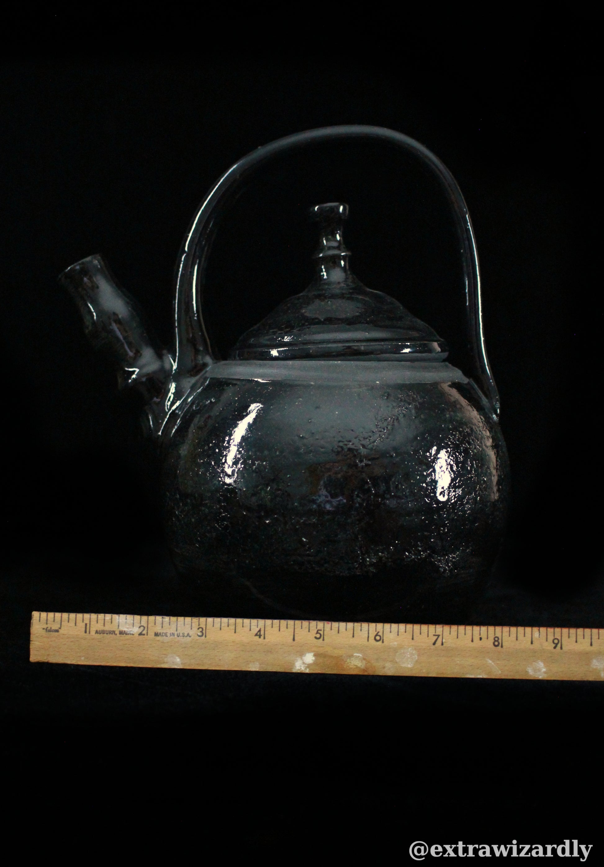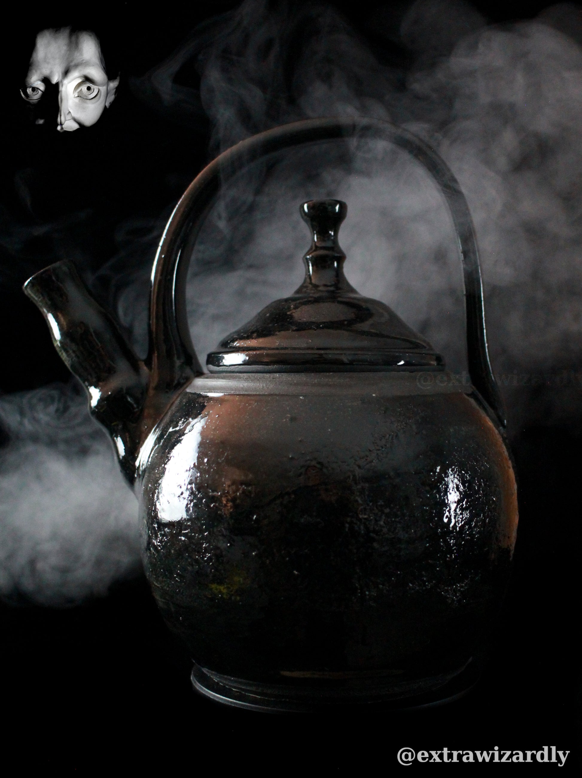 Steam curls from its spout like a summoning. The body—rough-textured as a cauldron’s underbelly, blackened as a midnight oak—wears its glossy overglaze like a sorcerer’s second skin: liquid-slick where the fire licked, matte where the shadows clung. The handle arches like a question, daring you to pour.
