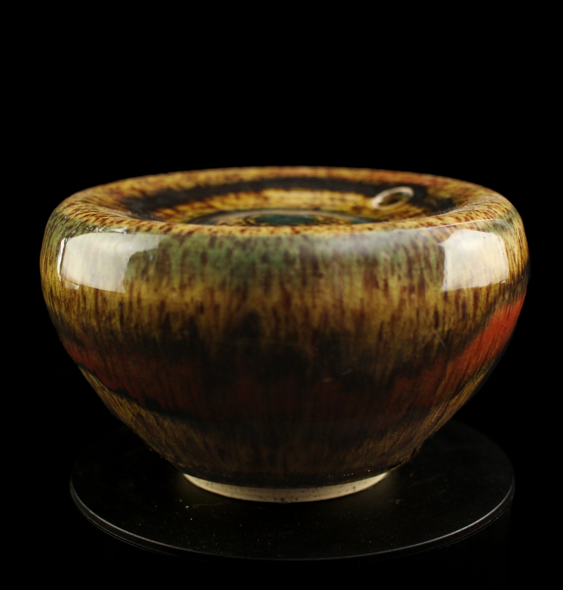 This unusual vase, in a poured honey glaze mirrors the gentle caress of Zephyrus, god of the west wind. Its flowing glaze adds a sense of lightness and ease to any room, bringing the breeze indoors, and its off center opening allows for a dynamic balancing act that can add some excitement to any breezy room.